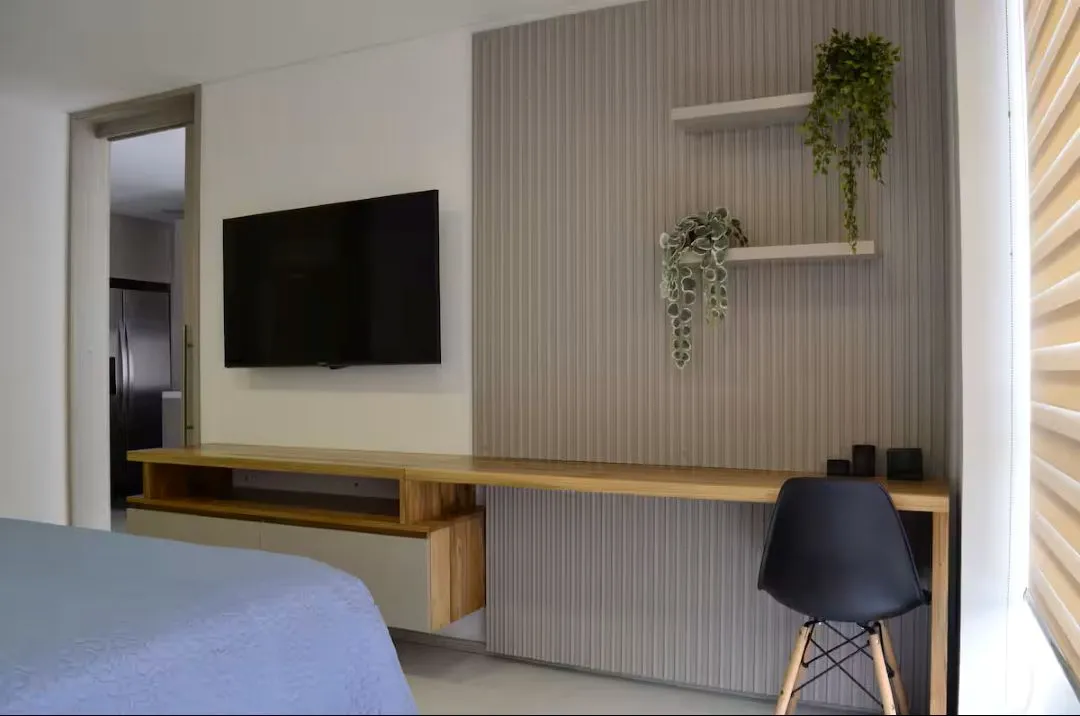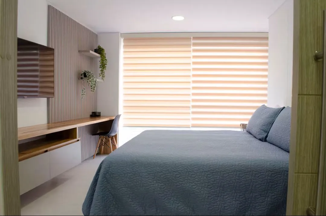 Disfruta de un dormitorio abierto, amplio y luminoso, cuenta con una cama king.
